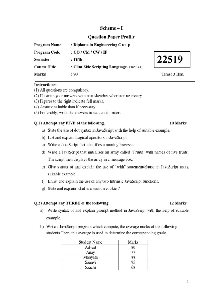 Clint Side Scripting Language Elective Sample Question Paper Msbte Study Resources Java Script Software Development