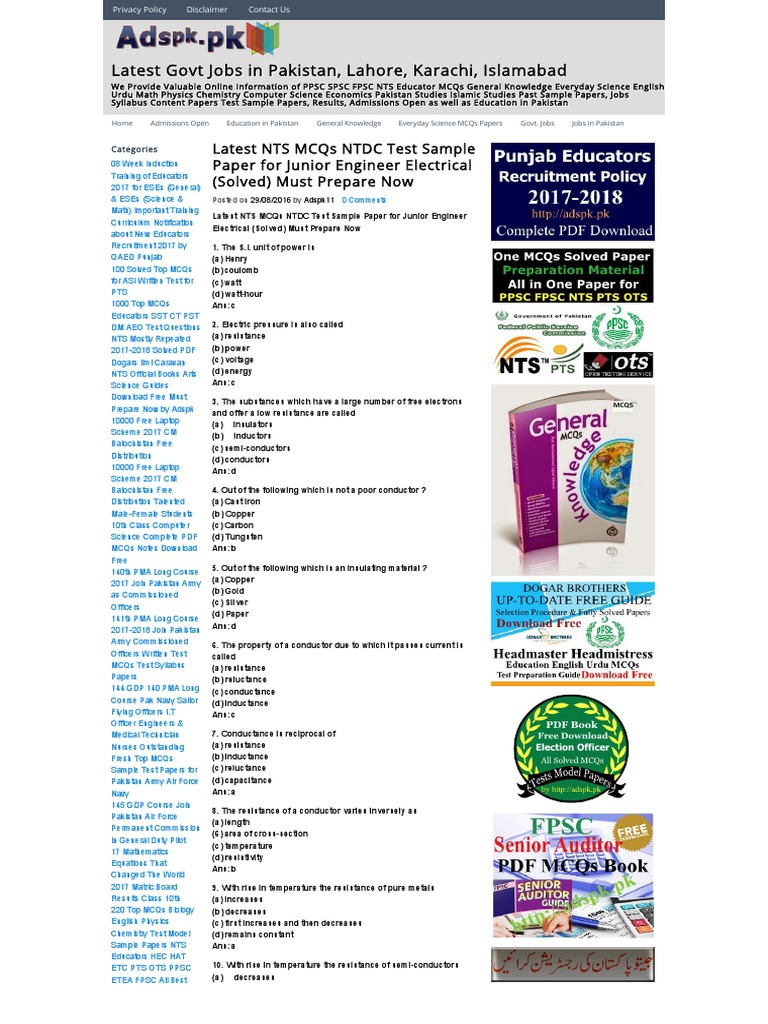 Latest Nts Mcqs Ntdc Test Sample Paper For Junior Engineer Electrical Solved Must Prepare Now La Electrical Resistance And Conductance Resistor