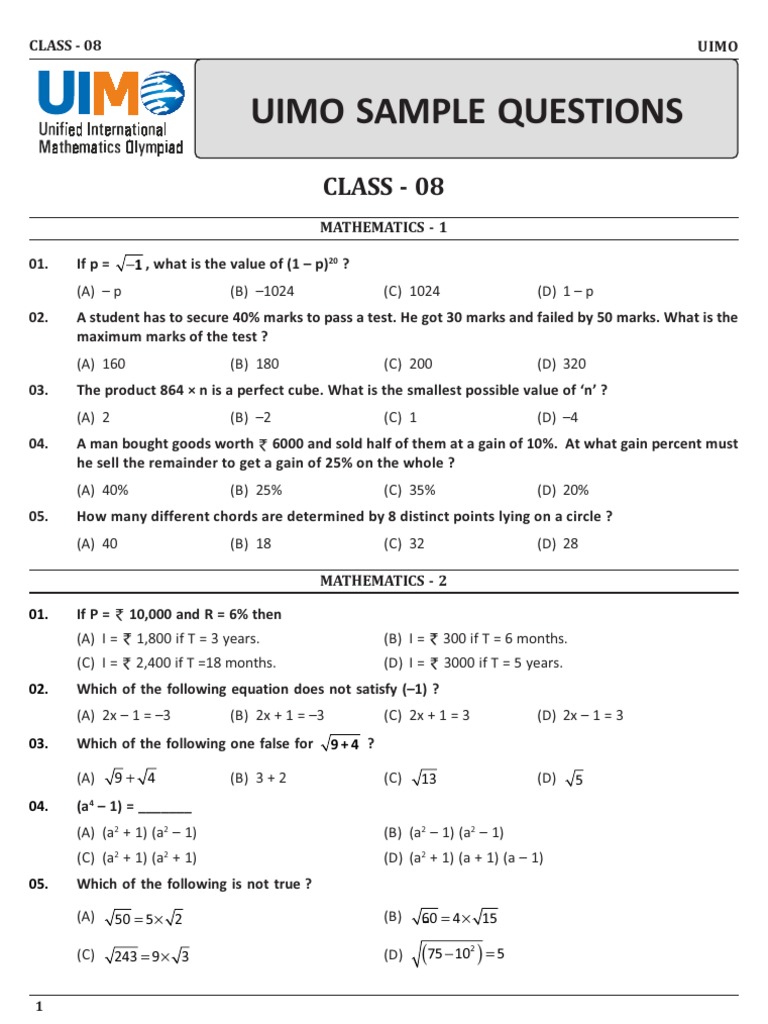 Uimo sample paper class 9. Math Olympiad for Class 9 - Download free International Math Olympiad sample papers question papers for Class 9. It can be downloaded from Vedantu and is recommended to serve as a supplement to ones regular academic studies. These IMO sample papers Free PDFs are very useful if you are preparing for the International Mathematics Olympiad exam and want to build a very strong.