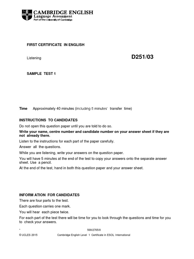 Cambridge-english-first-2015-sample-paper-1-listening v2pdf FIRST CERTIFICATE IN ENGLISH D25103 Listening SAMPLE TEST 1 Time Approximately 40 minutes including 5 minutes tr Views 64 Downloads 0 File size 309KB. 4 a 18 b. Read the instructions for each part of the paper carefully.
