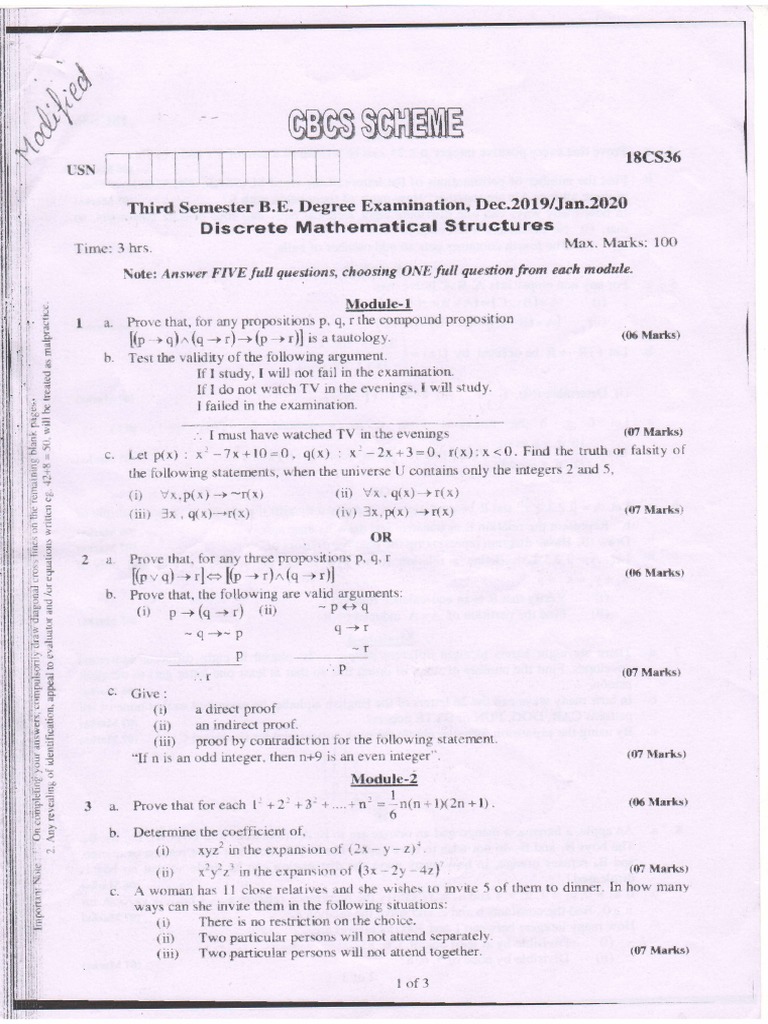 18cs36 Dms Vtu Question Paper Jan 2020 Mathematical Concepts Mathematical Relations